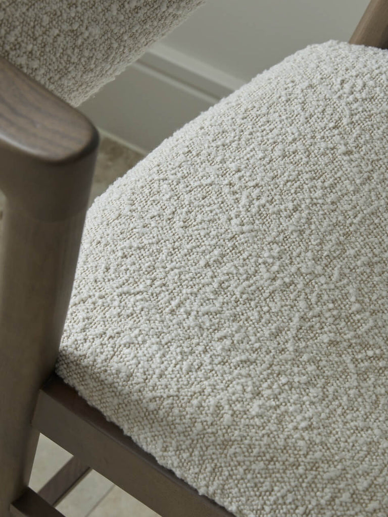 This chair is photographed in: Boucle pearl fabric and Grey wood