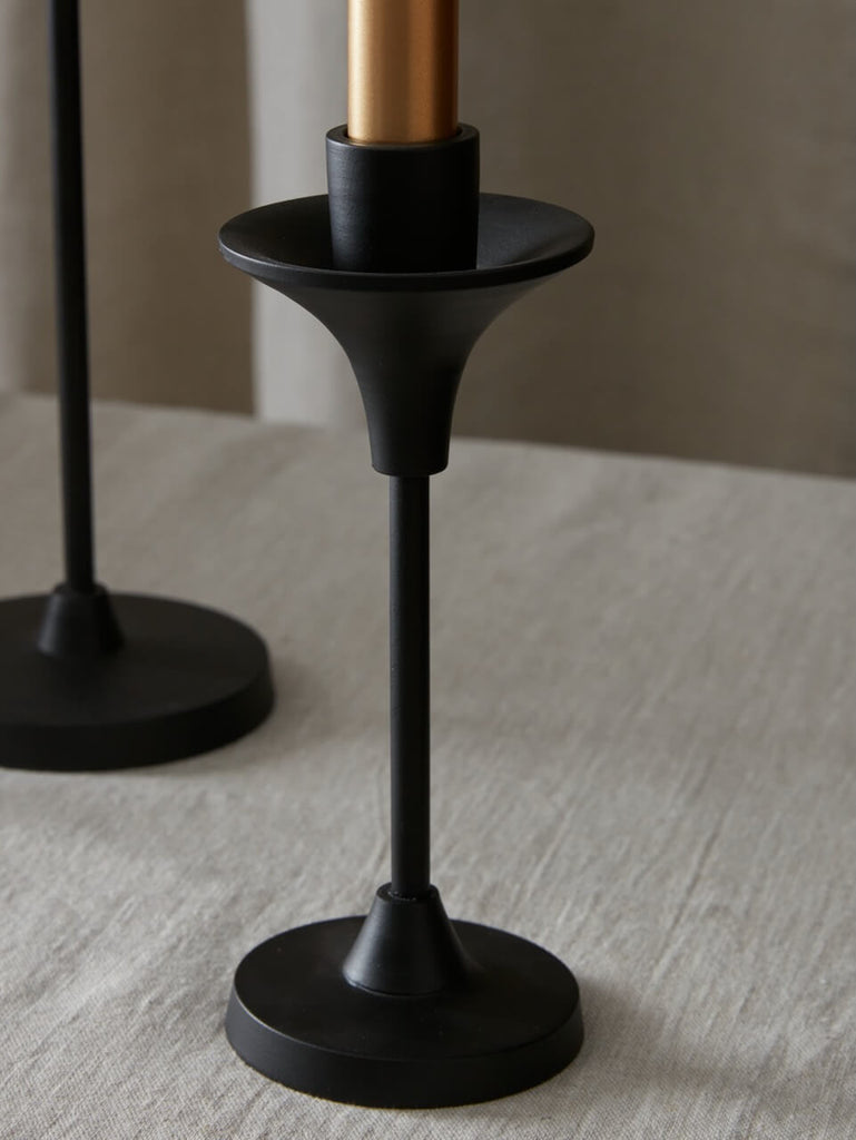 A dramatically elegant set of three candlesticks in matt black solid metal. In an array of heights to add interest to your table. This simple shape which bring a touch of style and sophistication to your table.