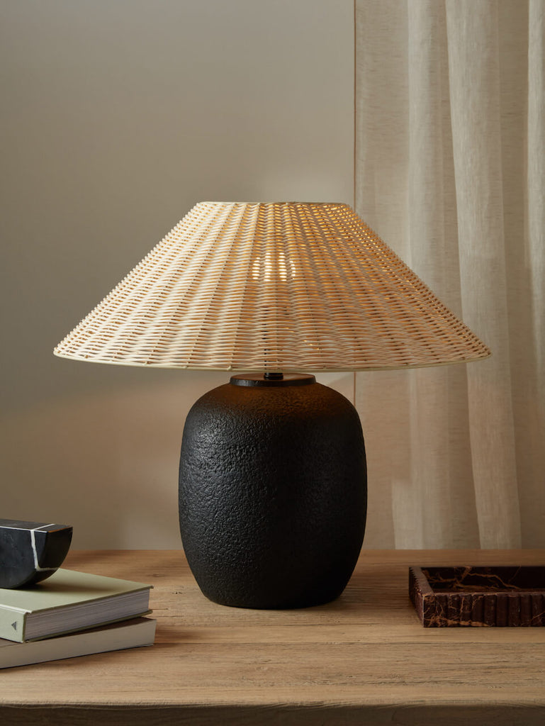 The Ligero Ceramic Table lamp is a statement piece. A jet black base of textured ceramic brings depth to your scheme whilst the natural element of rattan shade adds warmth to the overall look, not to mention a beautifully soft ambient light to your home.