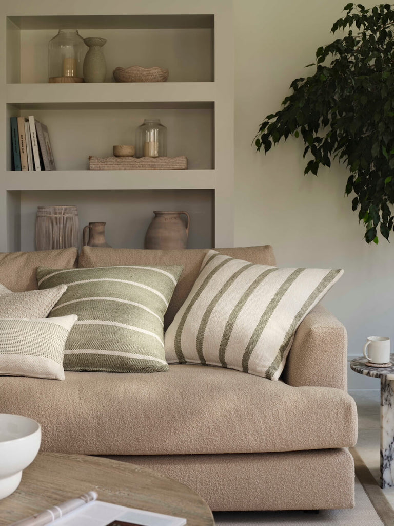 Our Green Stripe Cotton Cushion Cover adds a burst of colour to your living room or bedroom, with a smart sage green base interspersed with soft cream stripes. Complement with our Cream Heavy Linen Cushion Cover for a softer natural look.