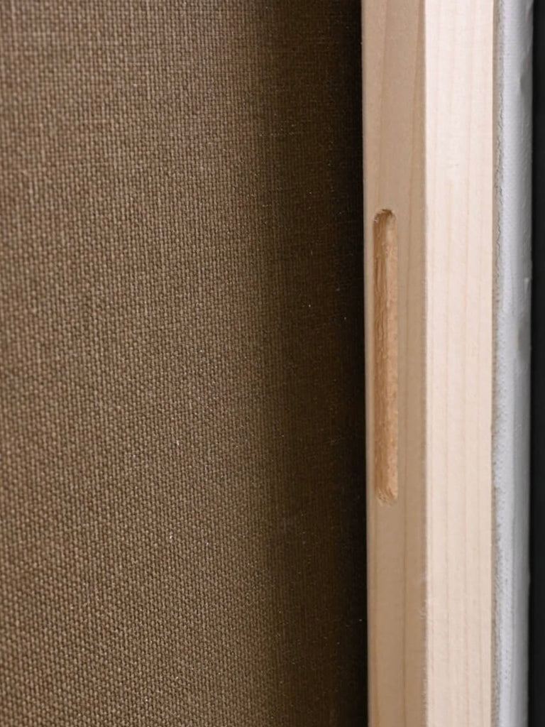 A framed painting with hanging grooves embedded into the wood enabling you to hang the art both portrait or landscape.