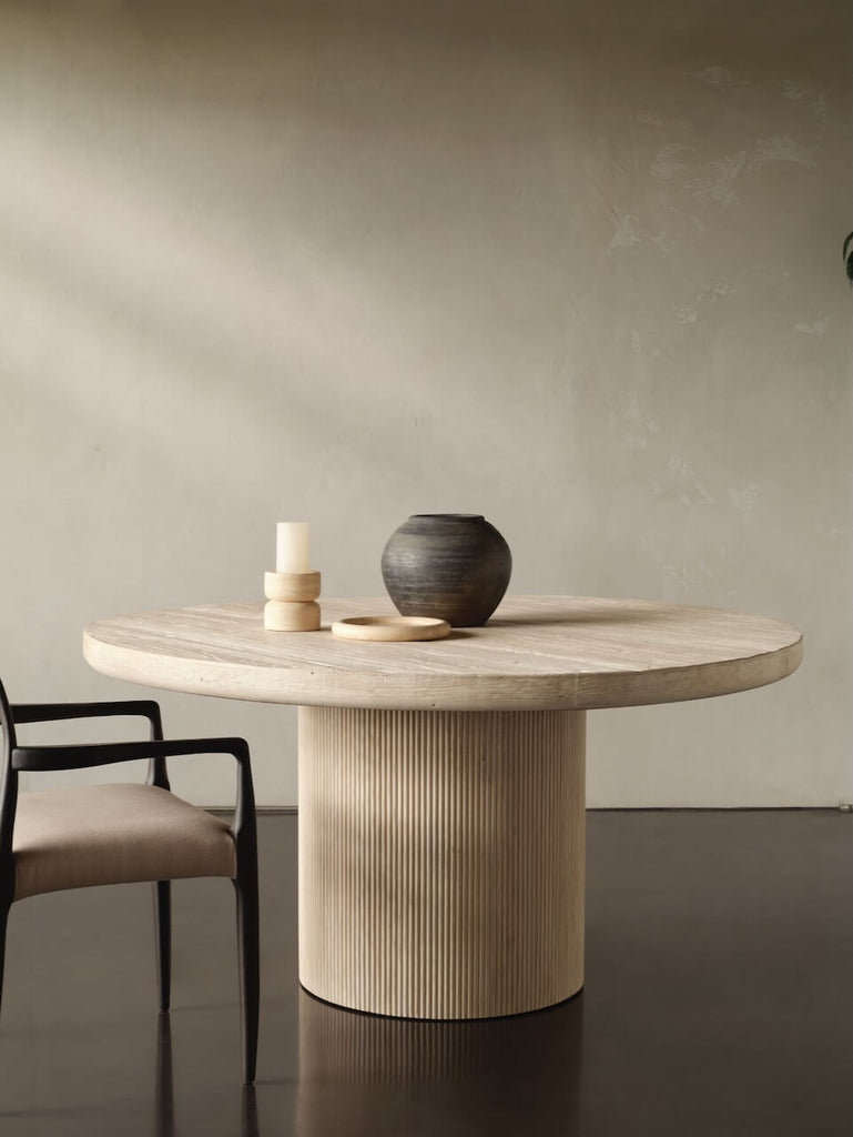 The Milford round wooden dining table is a stunning new addition to our furniture range. Made of reclaimed elm the surface of the table has beautiful grain detail and smooth edges complemented by a modern base with ribbed detail. A soft white wash completes the look and lightens the tone of the wood to a light blond colour. Seats 4-6 people.