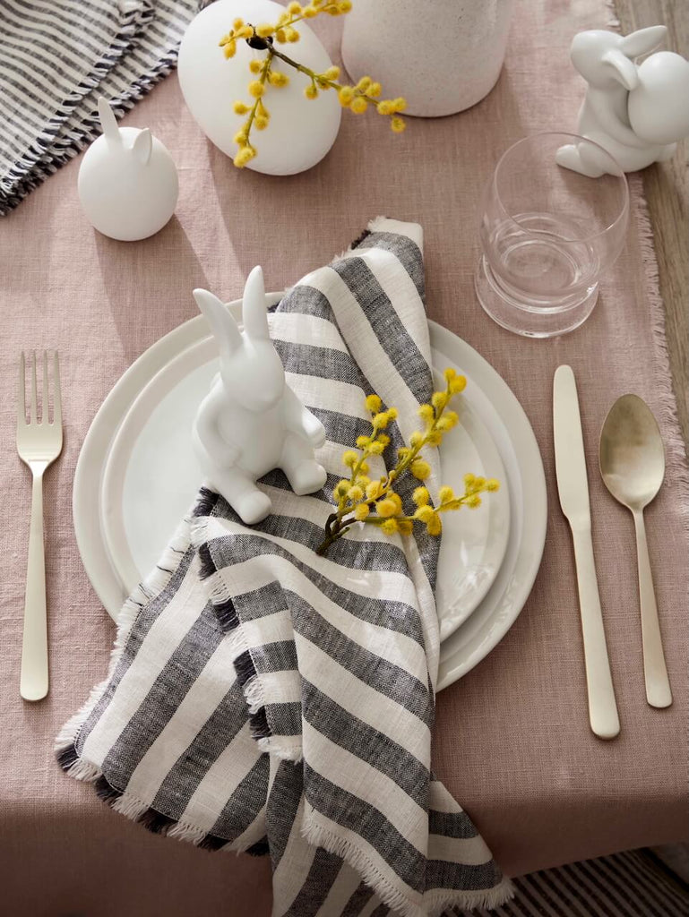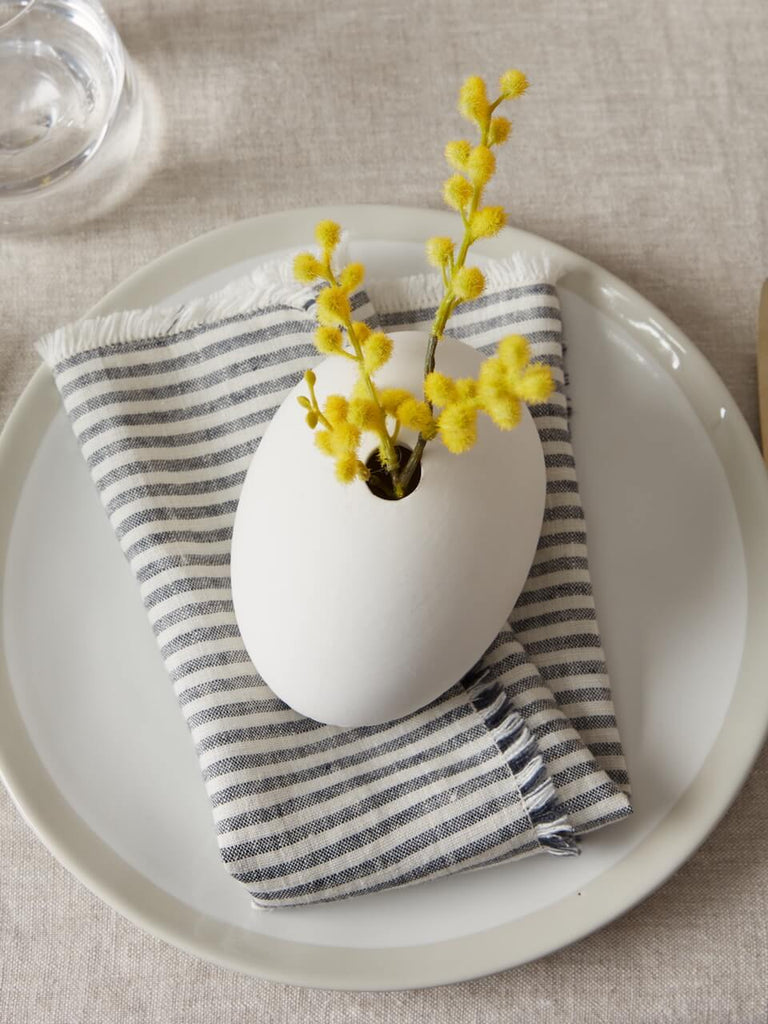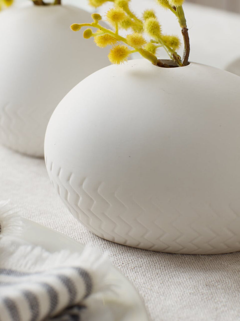 Use the set of three white ceramic bud decorations to style your faux blooms or dried flowers on your Easter table. These decorations do have a hole in the bottom so cannot be filled with water although you can place a few real sprigs in just for the day. We have styled ours with a few sprigs pulled off our new Faux Mimosa stems.