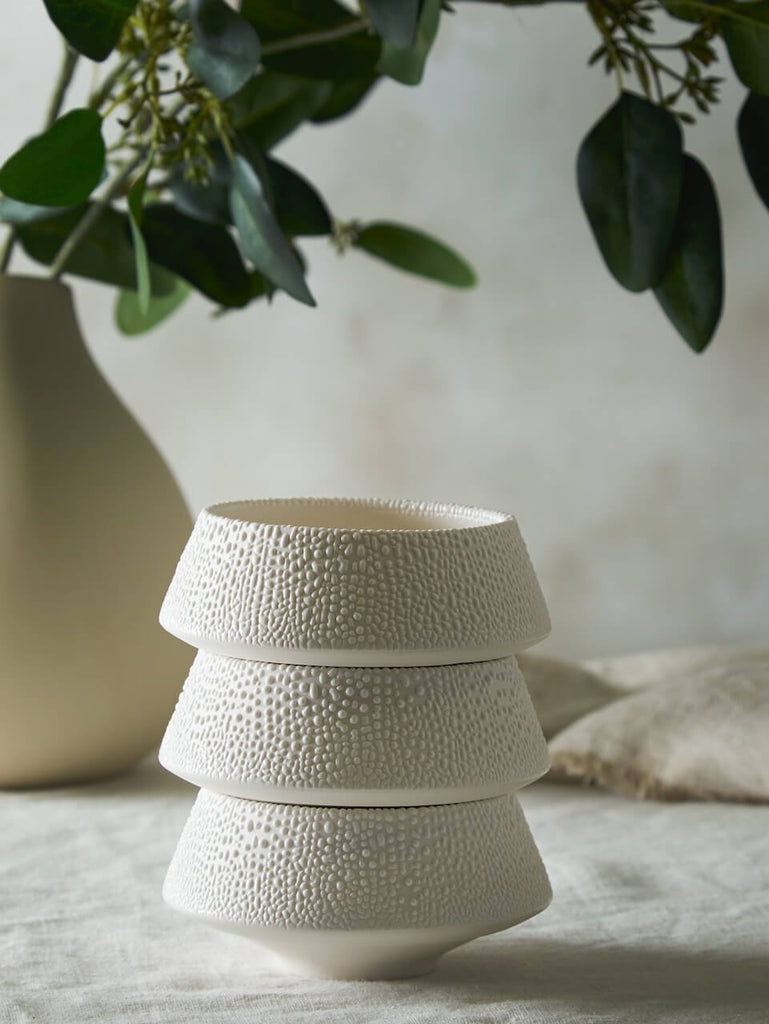 The perfect way to create a wonderful atmosphere on your deign table, these ceramic tealight holders have a footed base and wide angular upper which appears to make them float. Finished in a matt ceramic which has been speckled with dots to give a more textured finish. Sold as a set of three.